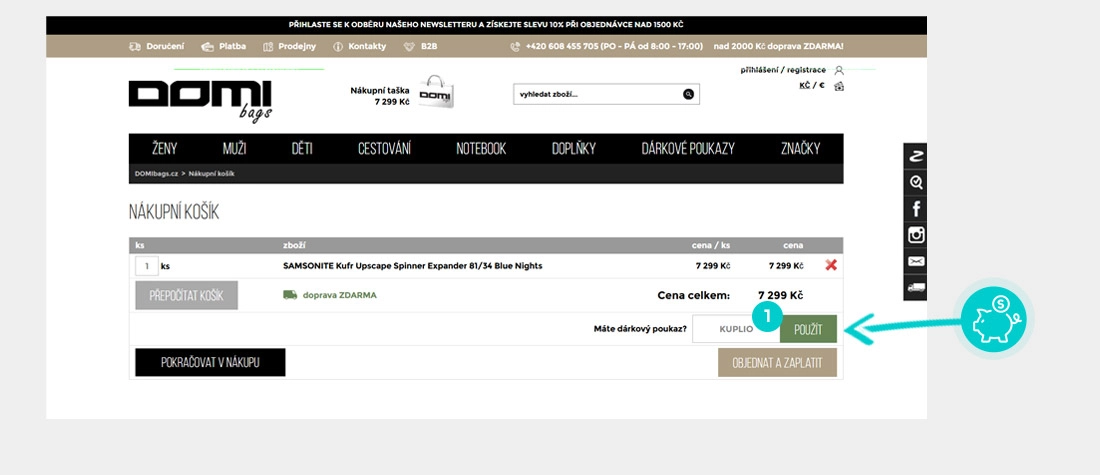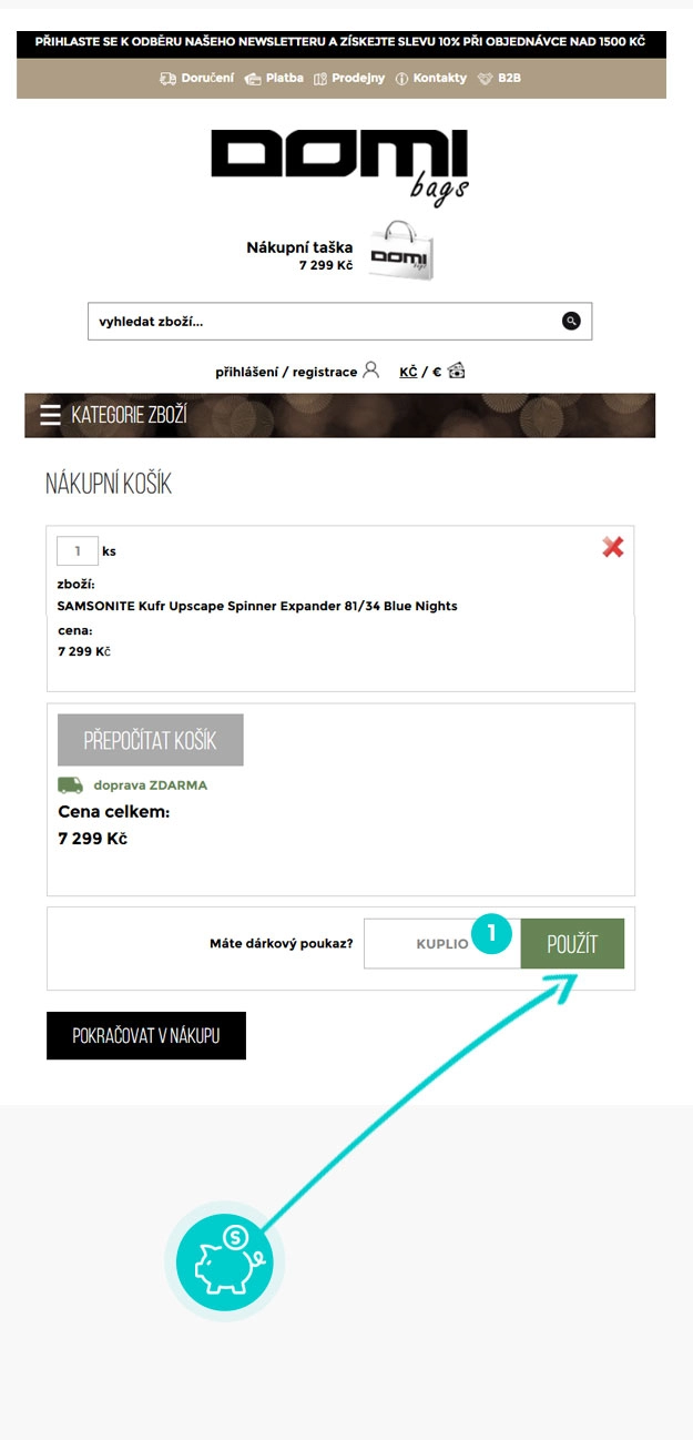 Vyberte si produkt v eshopu Domibags.cz, o který máte zájem, stiskněte tlačítko "Vložit do košíku" a produkt se automaticky vloží do nákupního košíku. Přímo v nákupním košíku vedle vybraných produktů klikněte na políčko "Máte dárkový poukaz?". Zde vložte zkopírovaný slevový kód nebo jej ručně vepište a potvrďte tlačítkem "Použít".