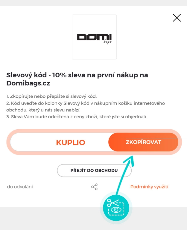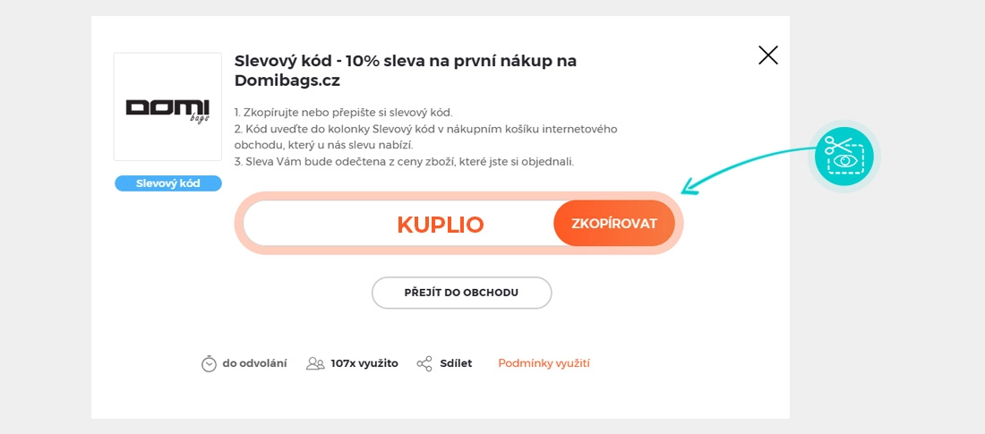 Zkopírujte nebo si opište slevový kód a klikněte na tlačítko "Přejít do obchodu". Následně budete přesměrováni přímo do eshopu Domibags.cz.