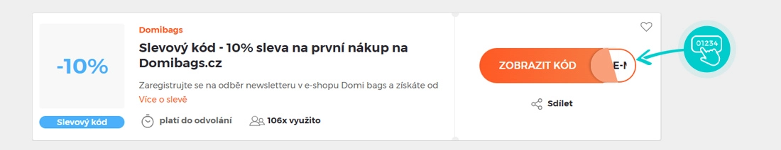 Vyberte si konkrétní slevový kód na naší stránce, který si chcete uplatnit v eshopu Domibags.cz. Klikněte na oranžové tlačítko "Zobrazit kód".
