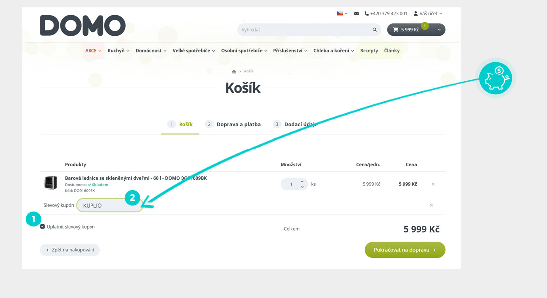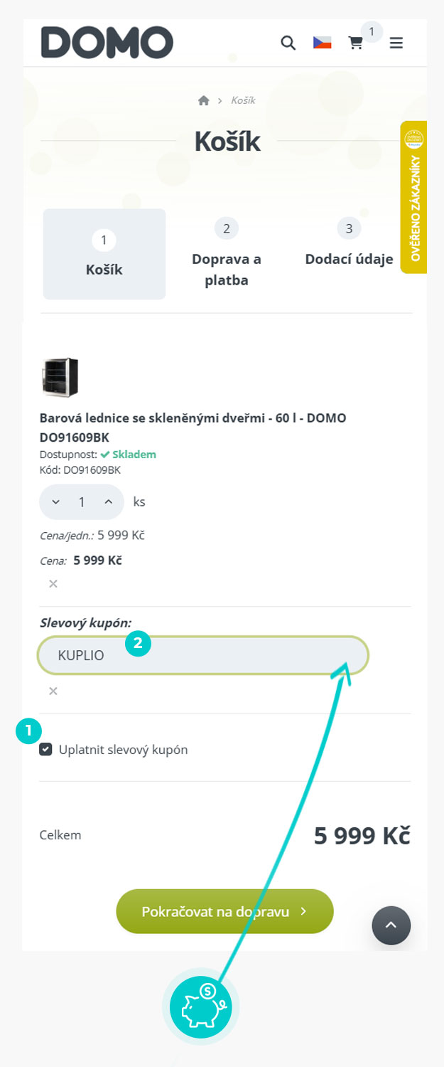 Vyberte si produkt v e-shopu domo-elektro.cz, o který máte zájem, stiskněte tlačítko "Do košíku" a produkt se automaticky vloží do nákupního košíku. Přímo v nákupním košíku pod vybranými produkty klikněte na políčko "Vložit svůj kód". Zde vložte zkopírovaný slevový kód nebo jej ručně vepište a zašrktnéte "Uplatnit slevový kupón".