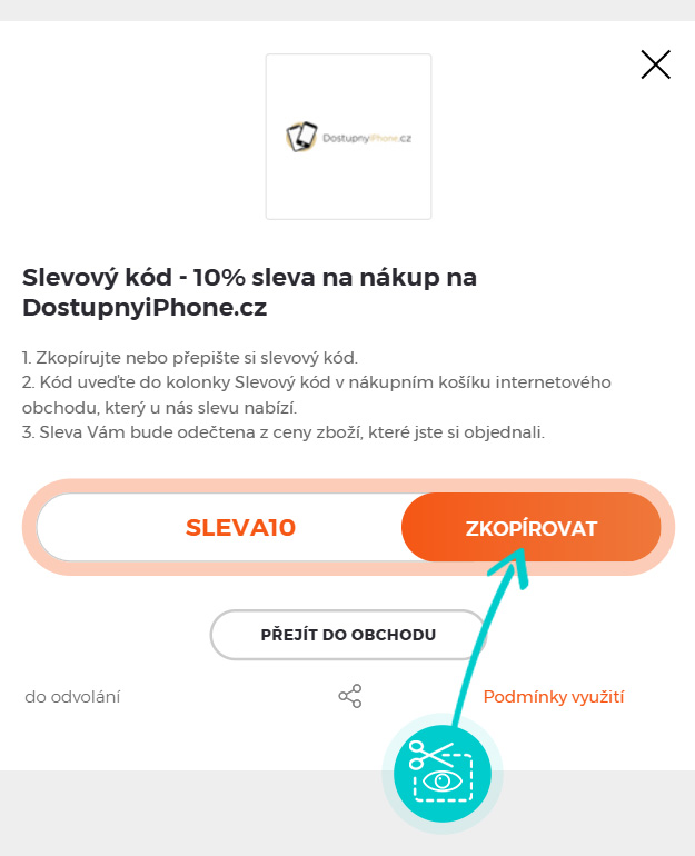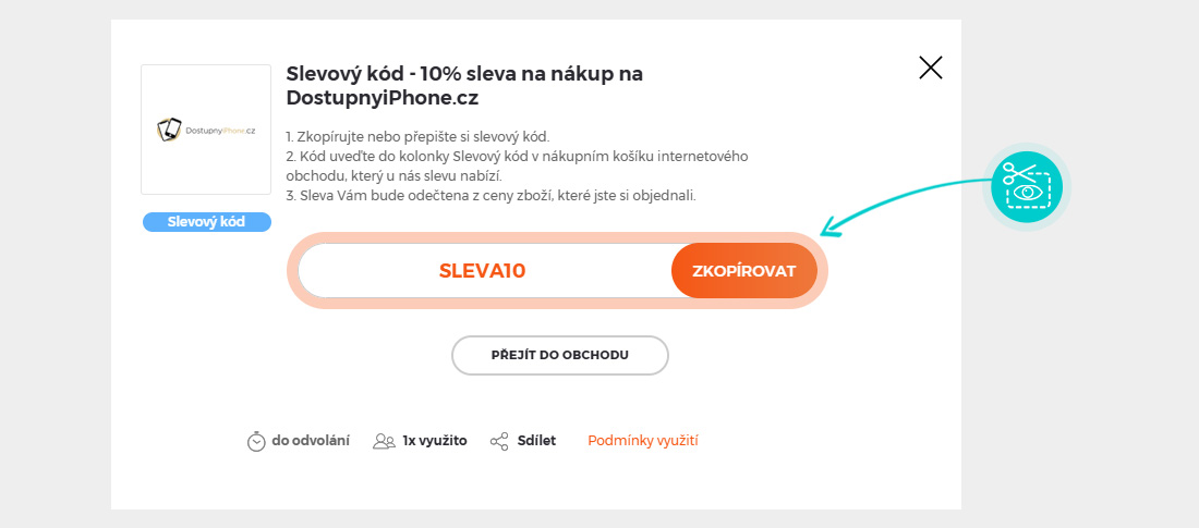 Zkopírujte nebo si opište slevový kód a klikněte na tlačítko "Přejít do obchodu". Následně budete přesměrováni přímo do eshopu Dostupnyiphone.cz.