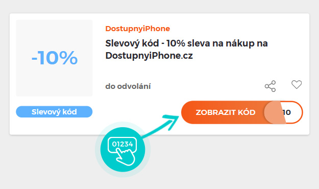 Vyberte si konkrétní slevový kód na naší stránce, který si chcete uplatnit v eshopu Dostupnyiphone.cz. Klikněte na oranžové tlačítko "Zobrazit kód".