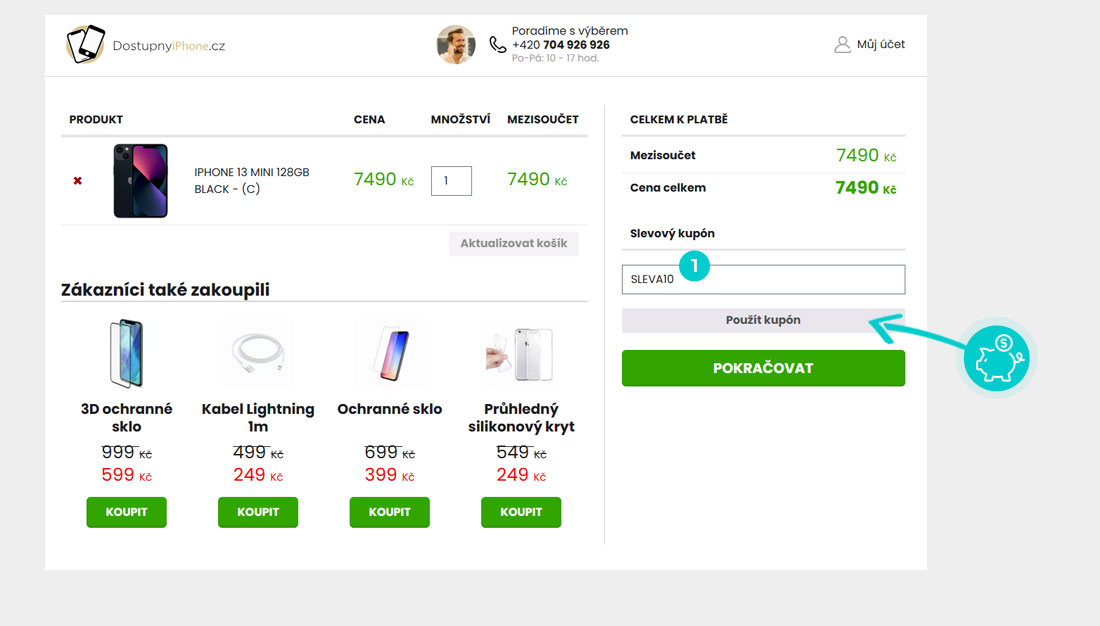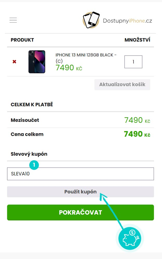 Vyberte si produkt v eshopu Dostupnyiphone.cz, o který máte zájem, stiskněte tlačítko "Vložit do košíku" a produkt se automaticky vloží do nákupního košíku. Přímo v nákupním košíku vedle vybraných produktů klikněte na políčko "Kód poukazu". Zde vložte zkopírovaný slevový kód nebo jej ručně vepište a potvrďte tlačítkem "Uplatnit".