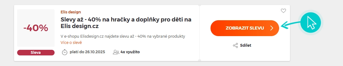 Vyberte si na naší stránce konkrétní Elis design slevu a klikněte na tlačítko "Získej slevu". Automaticky budete přesměrováni přímo na akční nabídku v internetovém obchodě Elisdesign.cz, kde můžete produkt nakoupit se slevou.