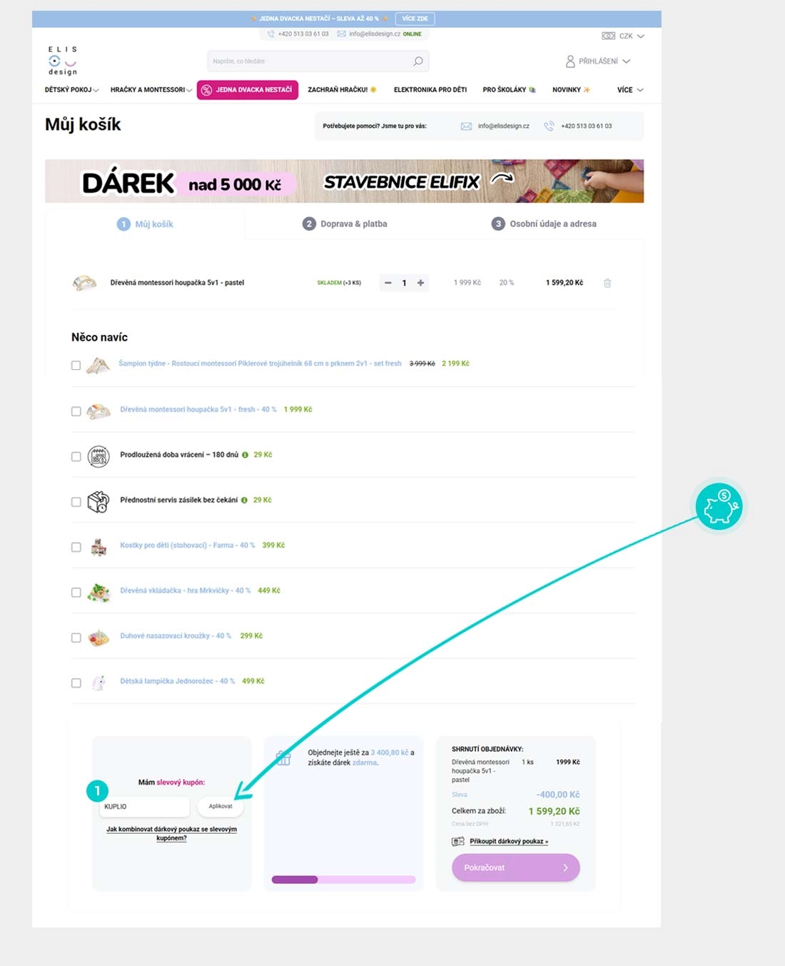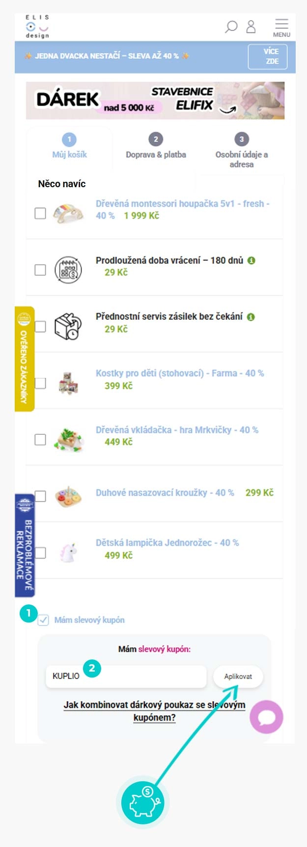 Vyberte si produkt v e-shopu Elisdesign.cz, o který máte zájem, stiskněte tlačítko "Vložit do košíku" a produkt se automaticky vloží do nákupního košíku. Přímo v nákupním košíku pod vybranými produkty v sekci Dokončit objednávku klikněte na políčko "Zadejte kód kupónu“. Zde vložte zkopírovaný slevový kód nebo jej ručně vepište a potvrďte tlačítkem "Aplikovat“.