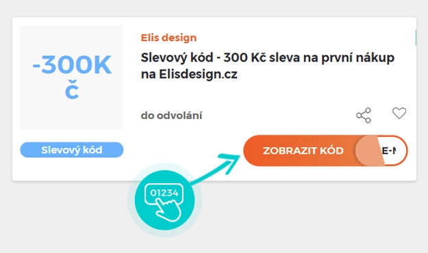 Vyberte si konkrétní slevový kód na naší stránce, který si chcete uplatnit v e-shopu Elisdesign.cz. Klikněte na oranžové tlačítko "Zobrazit kód".