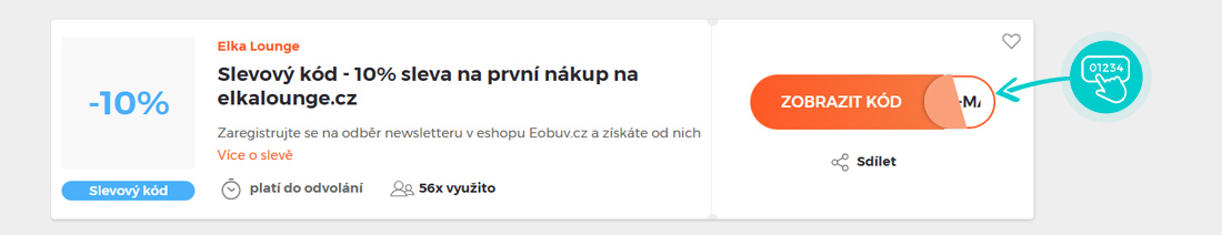 Vyberte si konkrétní slevový kód na naší stránce, který si chcete uplatnit v eshopu Elkalounge.cz. Klikněte na oranžové tlačítko "Zobrazit kód".