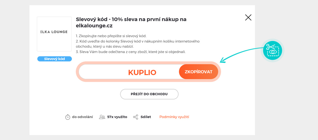 Zkopírujte nebo si opište slevový kód a klikněte na tlačítko "Přejít do obchodu". Následně budete přesměrováni přímo do eshopu Elkalounge.cz.