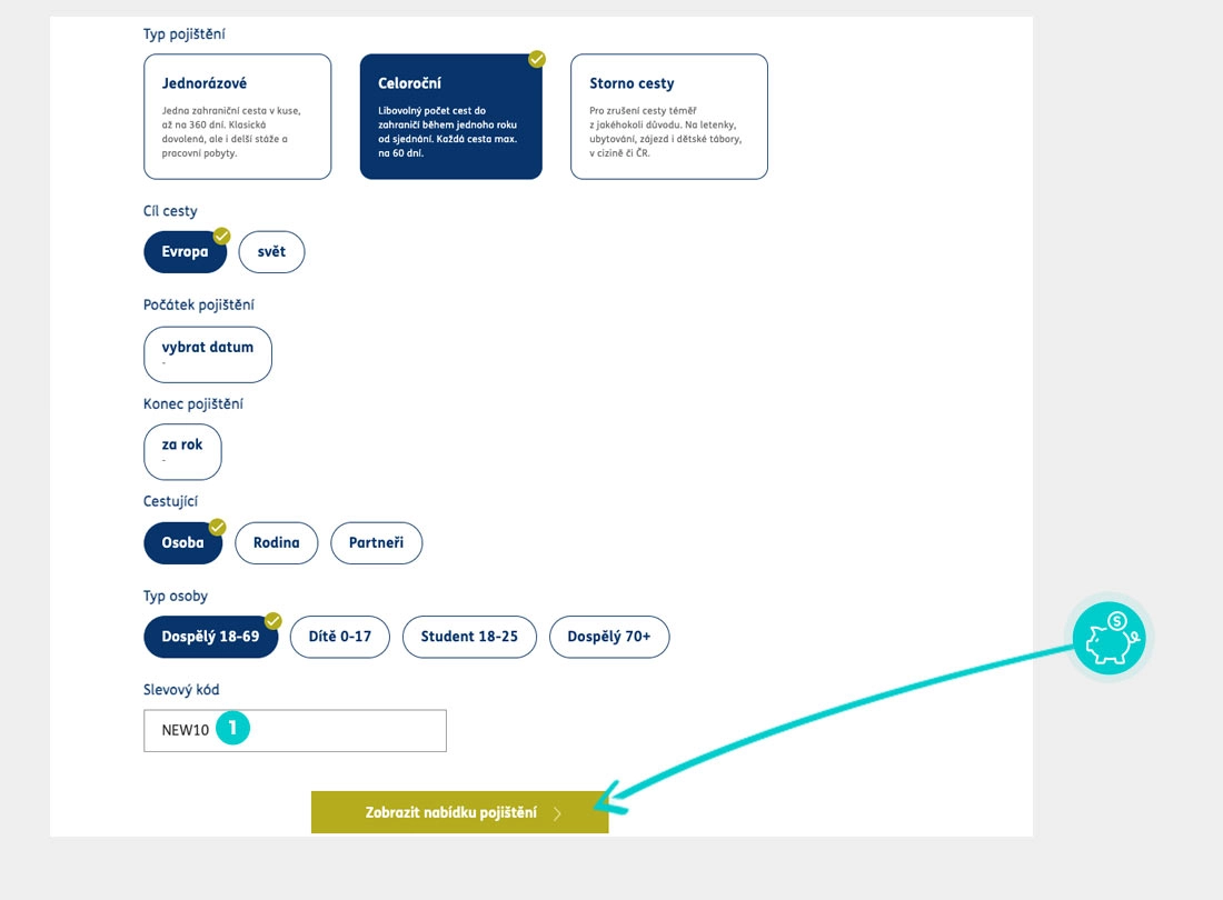 Vyberte si produkt v eshopu ervpojistovna.cz, o který máte zájem, stiskněte tlačítko "Koupit" a produkt se automaticky vloží do nákupního košíku. Přímo v nákupním košíku najdete pod vámi vybraným produktem políčko "Slevový kód". Zde vložte zkopírovaný slevový kód nebo jej ručně vepište a potvrďte tlačítkem "Zobrazit nabídku pojištění".