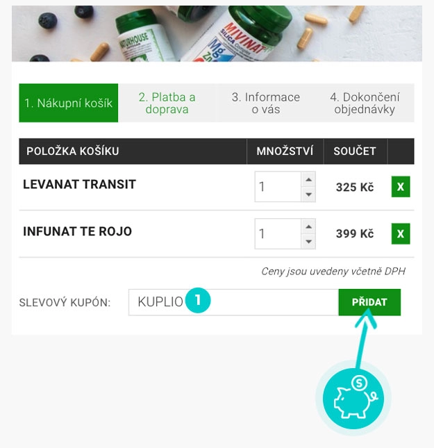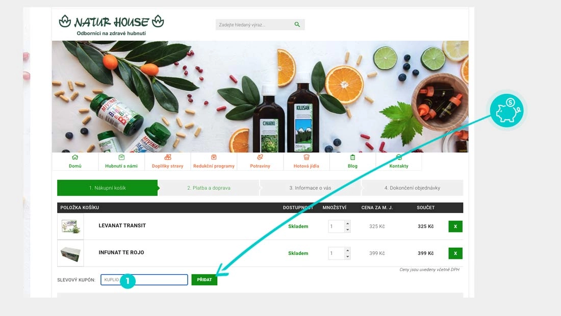 Vyberte si produkt v eshopu eshop-naturhouse.cz, o který máte zájem, stiskněte tlačítko "Do košíku" a produkt se automaticky vloží do nákupního košíku. Přímo v nákupním košíku pod vybranými produkty klikněte na políčko "Vložte slevový kupón". Zde vložte zkopírovaný slevový kód nebo jej ručně vepište a potvrďte tlačítkem "Přidat".
