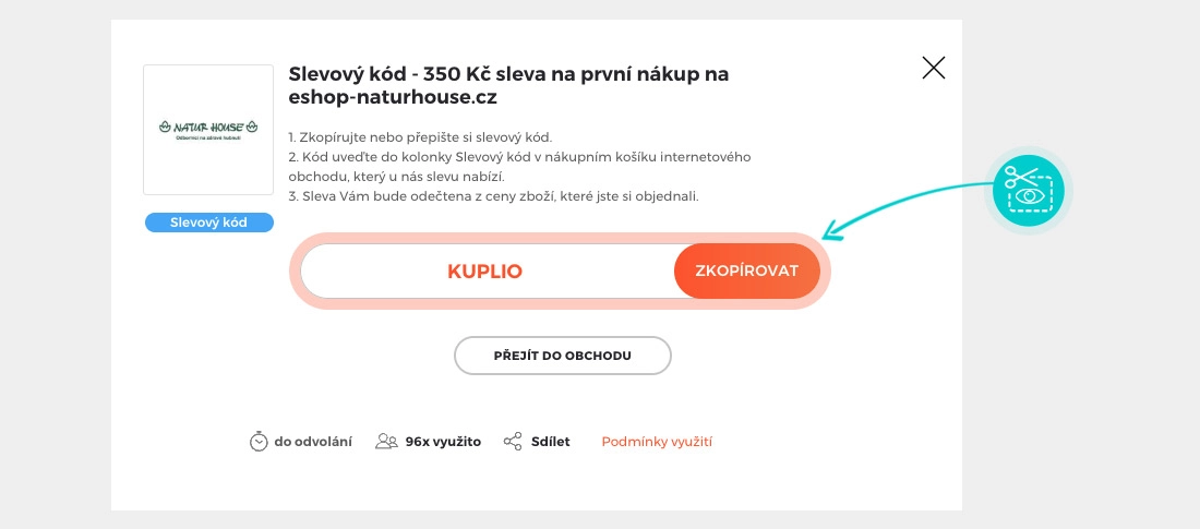 Zkopírujte nebo si opište slevový kód a klikněte na tlačítko "Přejít do obchodu". Následně budete přesměrováni přímo do eshopu eshop-naturhouse.cz.