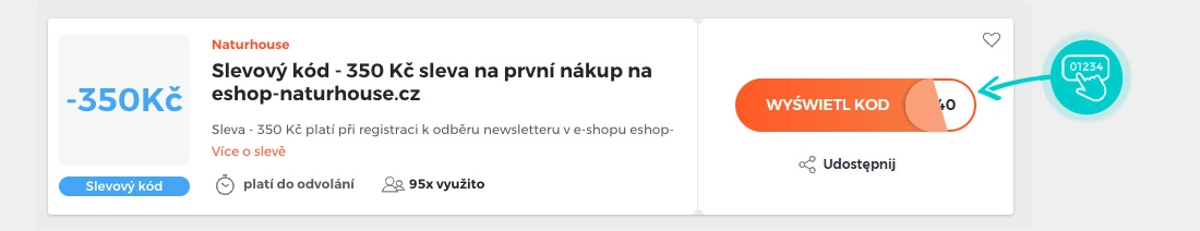 Vyberte si konkrétní slevový kód na naší stránce, který si chcete uplatnit v eshopu eshop-naturhouse.cz. Klepněte na oranžové tlačítko „Zobrazit kód“.