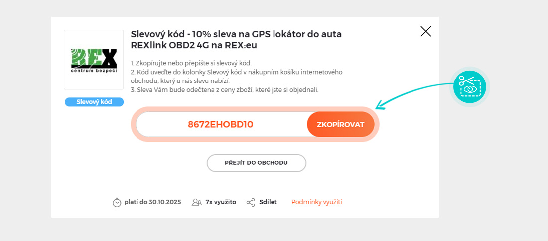 Sleva - 10% platí na nákup produktu GPS lokátor REXlink OBD2 4G v e-shopu Rex.eu, pokud zadáte slevový kód v nákupním košíku. Využijte slevové kupóny REX a nakupujte levněji zabezpečení všeho na čem vám záleží.