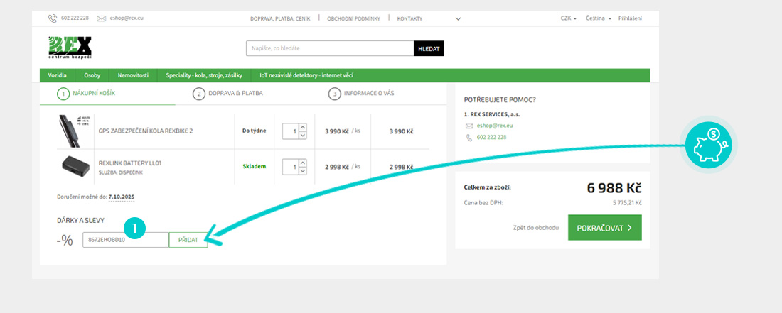 Vyberte si produkt v eshopu eshop.rex.eu, o který máte zájem, stiskněte tlačítko "Přidat do košíku" a produkt se automaticky vloží do nákupního košíku. Přímo v nákupním košíku pod vybranými produkty klikněte na políčko "Vložit slevový kupón". Zde vložte zkopírovaný slevový kód nebo jej ručně vepište a potvrďte tlačítkem "Přidat".