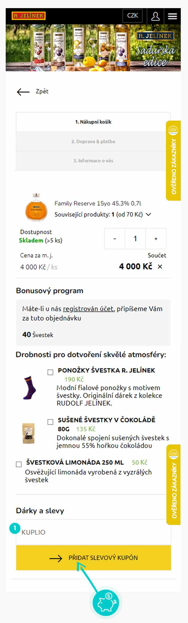 Vyberte si produkt v e-shopu Eshop.rjelinek.cz, o který máte zájem, stiskněte tlačítko "Přidat do košíku" a produkt se automaticky vloží do nákupního košíku. Přímo v nákupním košíku najdete pod vámi vybraným produktem políčko "Použít slevový kupón". Zde vložte zkopírovaný slevový kód nebo jej ručně vepište a potvrďte tlačítkem "Použít kupón".