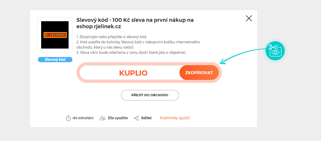 Zkopírujte nebo si opište slevový kód a klikněte na tlačítko "Přejít do obchodu". Následně budete přesměrováni přímo do e-shopu Eshop.rjelinek.cz.