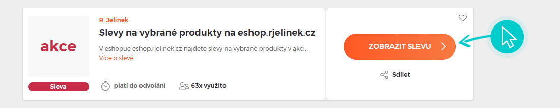 Vyberte si na naší stránce konkrétní R. Jelínek slevu a klikněte na tlačítko "Získej slevu". Automaticky budete přesměrováni přímo na akční nabídku v internetovém obchodě Eshop.rjelinek.cz, kde můžete produkt nakoupit se slevou.