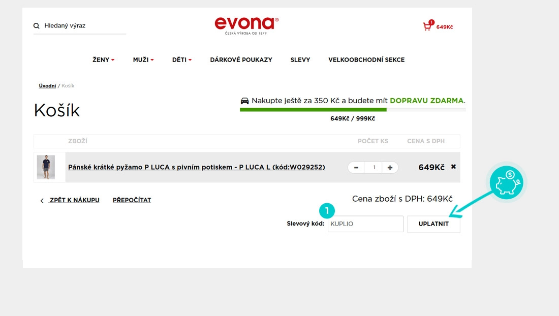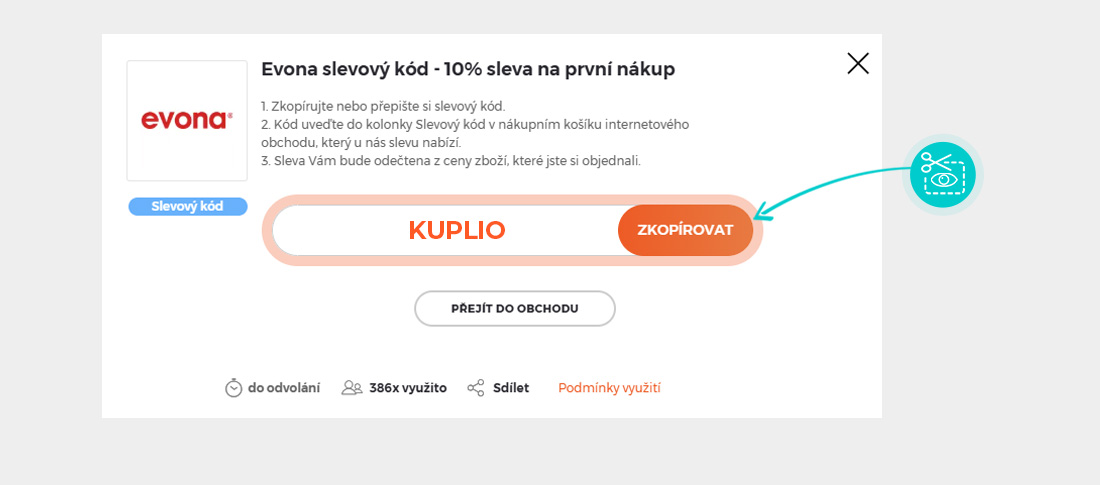 Zkopírujte nebo si opište slevový kód a klikněte na tlačítko "Přejít do obchodu". Následně budete přesměrováni přímo do eshopu Evona.cz.