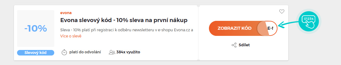 Vyberte si konkrétní slevový kód na naší stránce, který si chcete uplatnit v eshopu Evona.cz. Klikněte na oranžové tlačítko "Zobrazit kód".