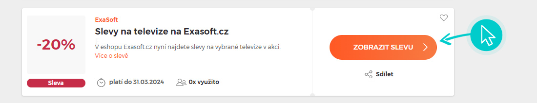Vyberte si na naší stránce konkrétní Exasoft slevu a klikněte na tlačítko "Získej slevu". Automaticky budete přesměrováni přímo na akční nabídku v internetovém obchodě Exasoft.cz, kde můžete produkt nakoupit se slevou.