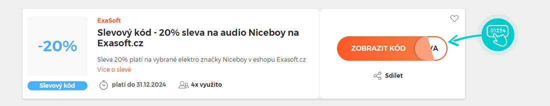Vyberte si konkrétní slevový kód na naší stránce, který si chcete uplatnit v e-shopu Exasoft.cz. Klikněte na oranžové tlačítko "Zobrazit kód".