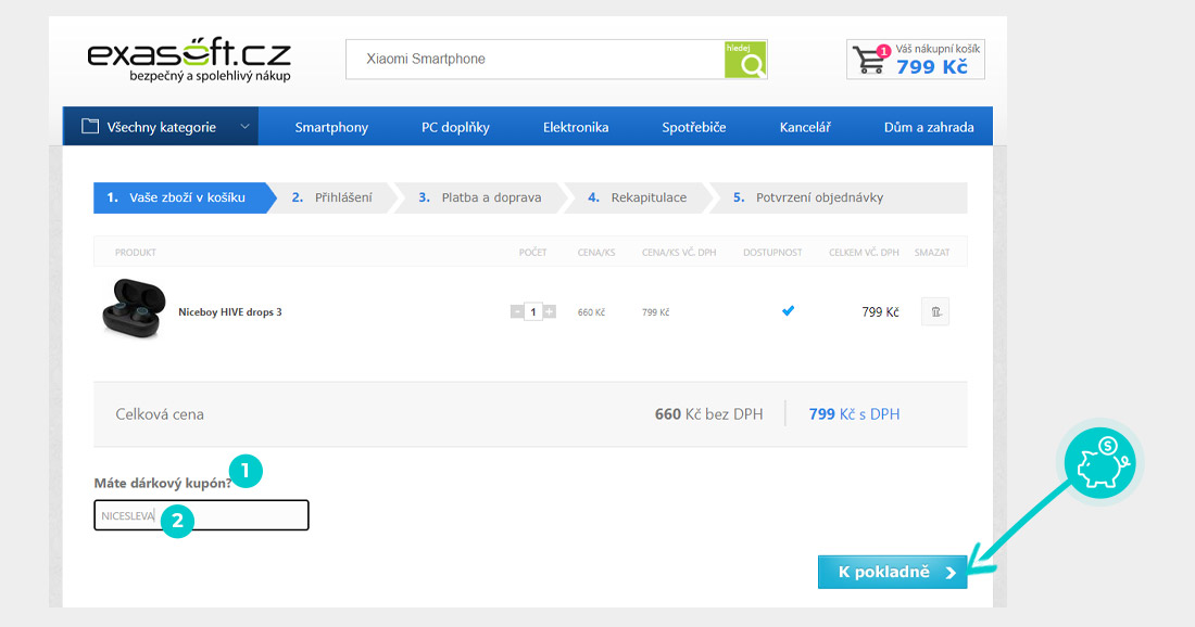 Vyberte si produkt v e-shopu Exasoft.cz, o který máte zájem, stiskněte tlačítko "Koupit" a produkt se automaticky vloží do nákupního košíku. Přímo v nákupním košíku najdete pod vámi vybraným produktem políčko "Máte dárkový kupón?". Zde vložte zkopírovaný slevový kód nebo jej ručně vepište a potvrďte tlačítkem "K pokladně".