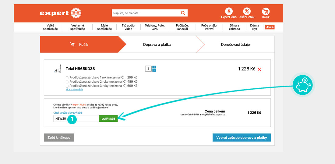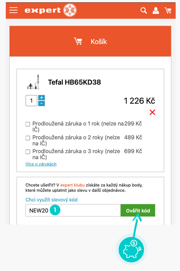 Vyberte si produkt v e-shopu Expert.cz, o který máte zájem, stiskněte tlačítko "Vložit do košíku" a produkt se automaticky vloží do nákupního košíku. Přímo v nákupním košíku pod vybranými produkty v sekci Dokončit objednávku klikněte na políčko "Váš kód“. Zde vložte zkopírovaný slevový kód nebo jej ručně vepište a potvrďte tlačítkem "Ověřit kód“.