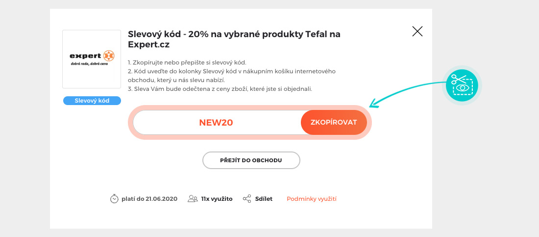 Zkopírujte nebo si opište slevový kód a klikněte na tlačítko "Přejít do obchodu". Následně budete přesměrováni přímo do e-shopu Expert.cz.