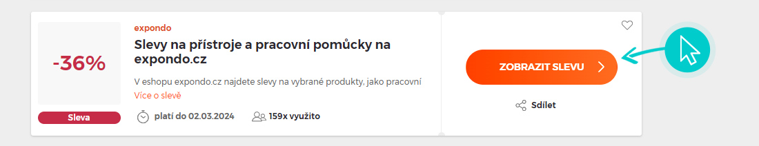 Vyberte si na naší stránce konkrétní Expondo slevu a klikněte na tlačítko "Získej slevu". Automaticky budete přesměrováni přímo na akční nabídku v internetovém obchodě Expondo.cz, kde můžete produkt nakoupit se slevou.