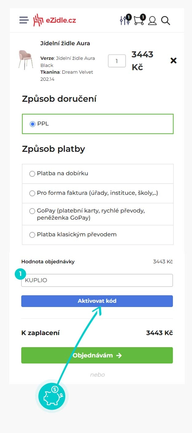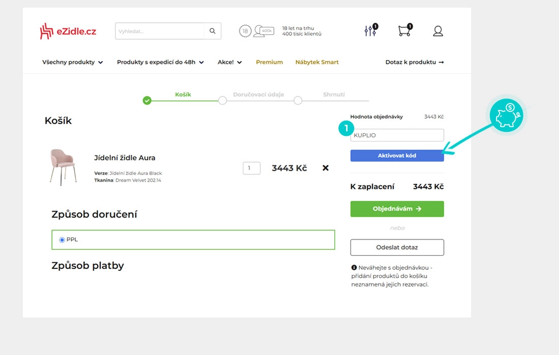 Vyberte si produkt v e-shopu eZidle.cz, o který máte zájem, stiskněte tlačítko "Přidat do košíku" a produkt se automaticky vloží do nákupního košíku. Přímo v nákupním košíku najdete pod vámi vybraným produktem políčko "Zadejte slevový kód". Zde vložte zkopírovaný slevový kód nebo jej ručně vepište a potvrďte tlačítkem "Aktivovat kód".