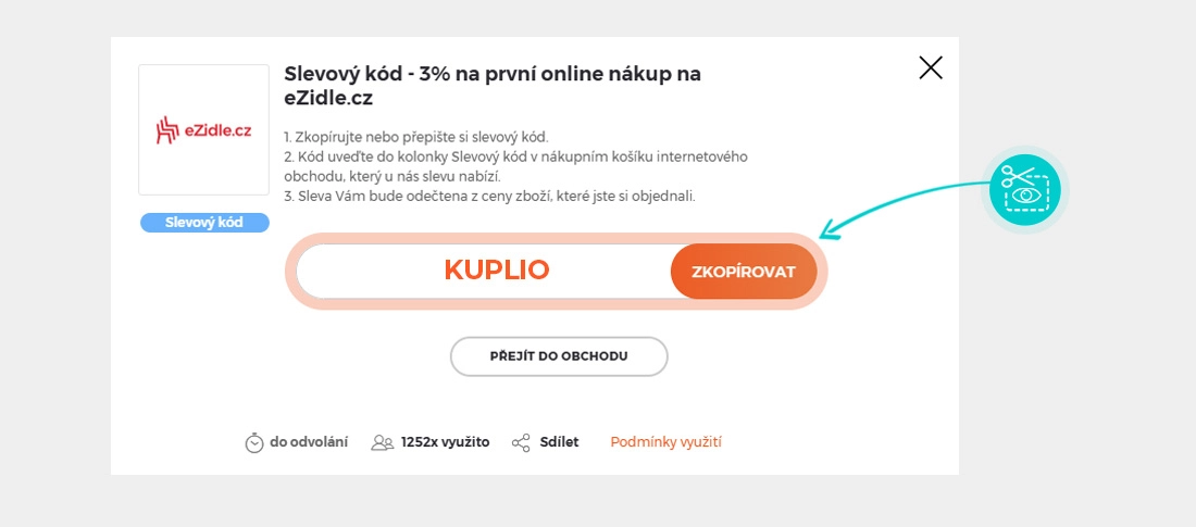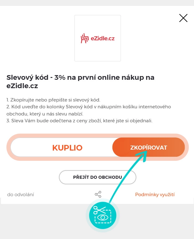 Zkopírujte nebo si opište slevový kód a klikněte na tlačítko "Přejít do obchodu". Následně budete přesměrováni přímo do e-shopu eZidle.cz.