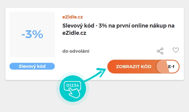 Vyberte si konkrétní slevový kód na naší stránce, který si chcete uplatnit v e-shopu eZidle.cz. Klikněte na oranžové tlačítko "Zobrazit kód".