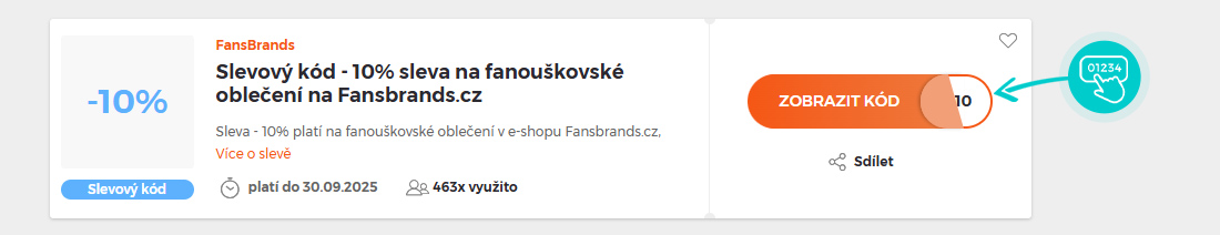 Vyberte si konkrétní slevový kód na naší stránce, který si chcete uplatnit v e-shopu Fansbrands.cz. Klikněte na oranžové tlačítko "Zobrazit kód".