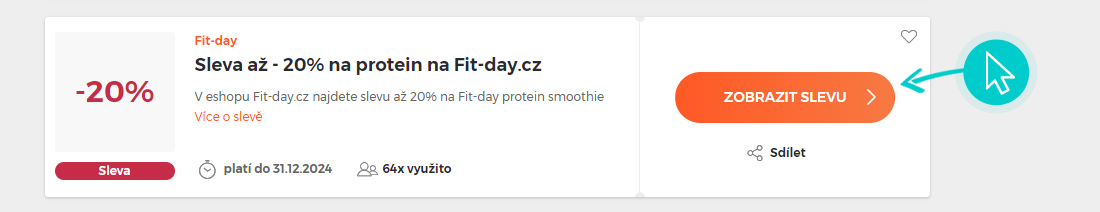 Vyberte si na naší stránce konkrétní Fit-day slevu a klikněte na tlačítko "Získej slevu". Automaticky budete přesměrováni přímo na akční nabídku v internetovém obchodě Fit-day.cz, kde můžete produkt nakoupit se slevou.