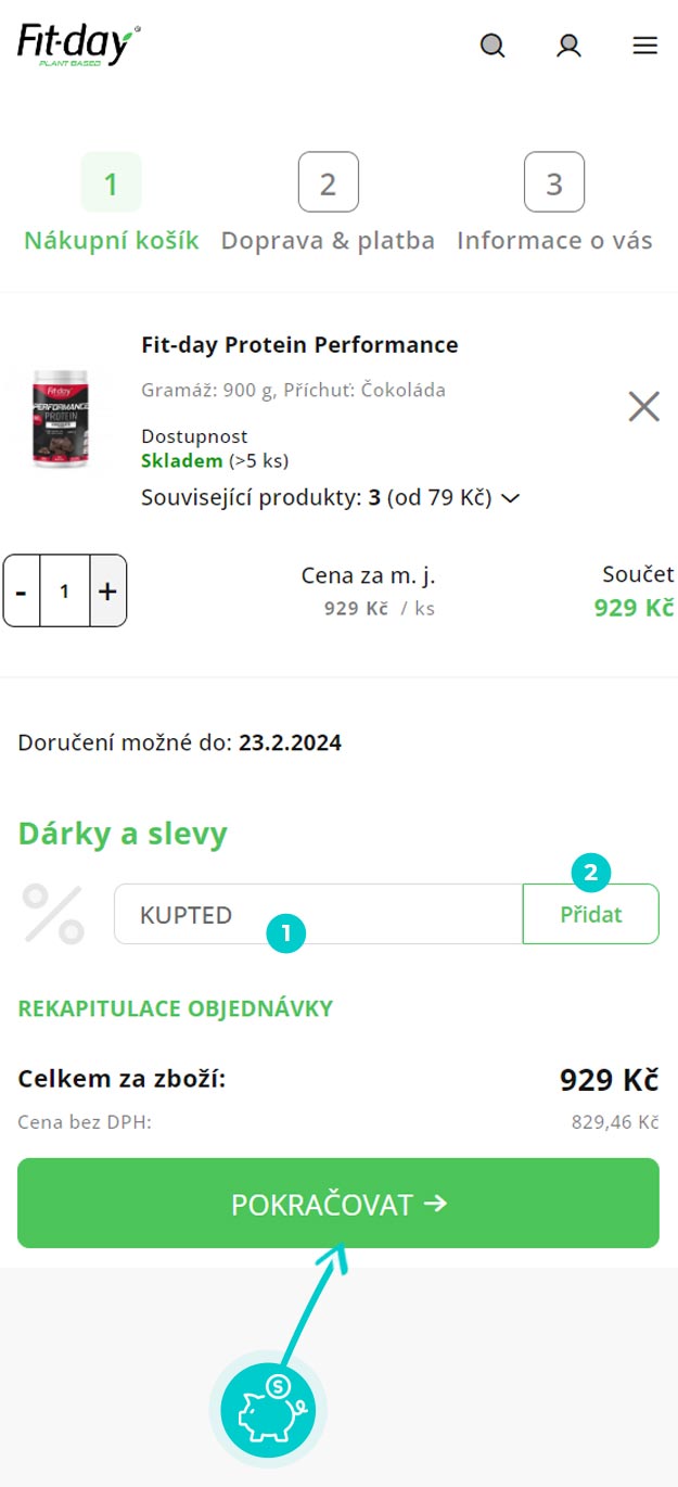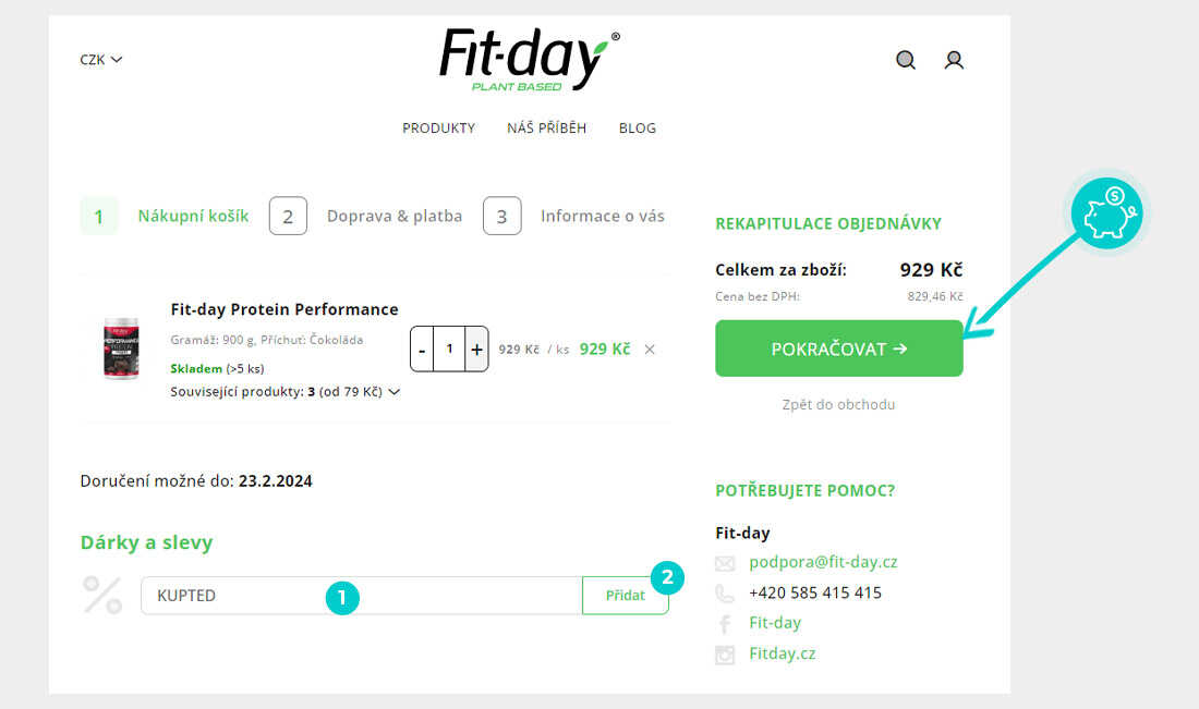 Vyberte si produkt v e-shopu Fit-day.cz, o který máte zájem, stiskněte tlačítko "Do košíku" a produkt se automaticky vloží do nákupního košíku. Přímo v nákupním košíku najdete pod vámi vybraným produktem políčko "Vložit slevový kupón". Zde vložte zkopírovaný slevový kód nebo jej ručně vepište a potvrďte tlačítkem "Přidat".