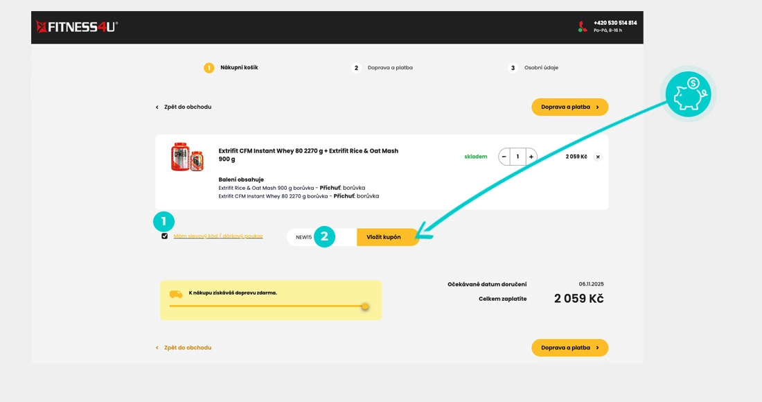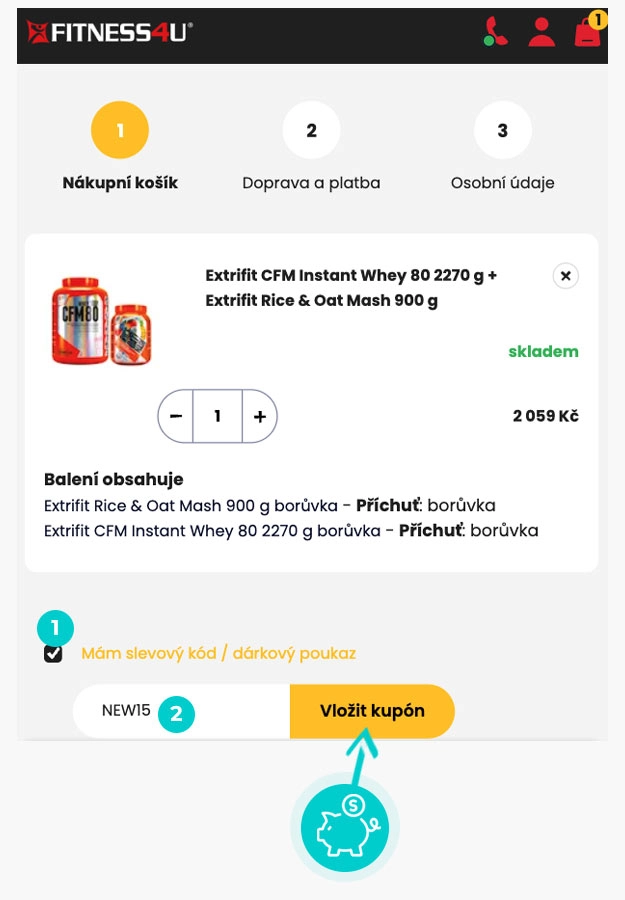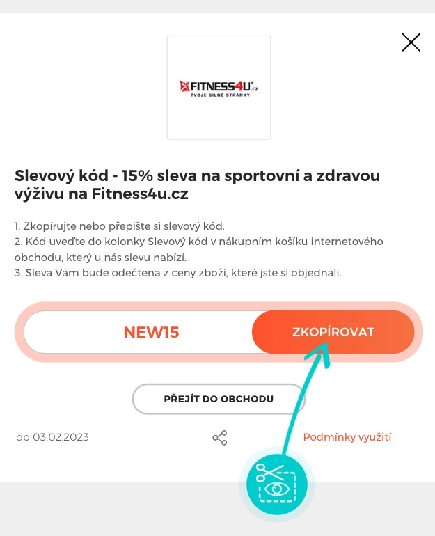 Zkopírujte nebo si opište slevový kód a klikněte na tlačítko "Přejít do obchodu". Následně budete přesměrováni přímo do e-shopu Fitness4u.cz.