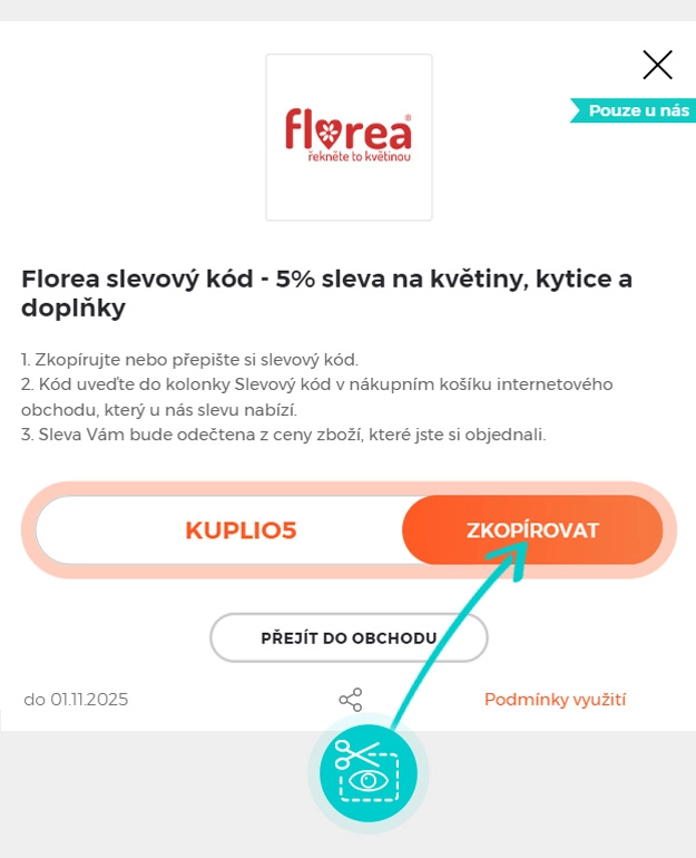 Zkopírujte nebo si opište slevový kód a klikněte na tlačítko "Přejít do obchodu". Následně budete přesměrováni přímo do e-shopu Florea.cz.