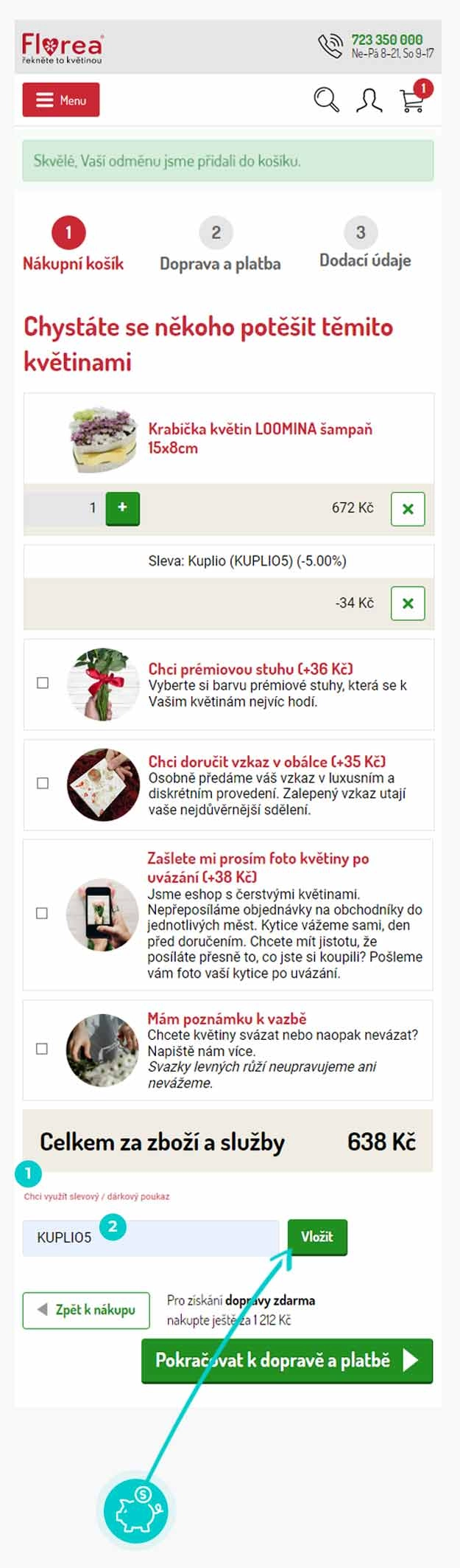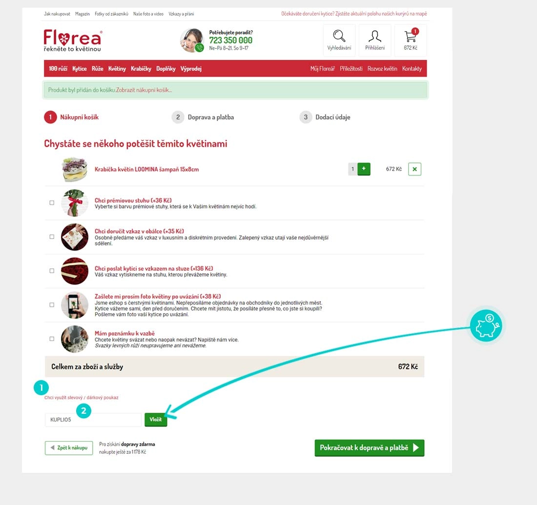 Vyberte si produkt v e-shopu Florea.cz, o který máte zájem, stiskněte tlačítko "Přidat do košíku" a produkt se automaticky vloží do nákupního košíku. Přímo v nákupním košíku najdete pod vámi vybraným produktem políčko "Chci využít slevový poukaz". Zde vložte zkopírovaný slevový kód nebo jej ručně vepište a potvrďte tlačítkem "Vložit.