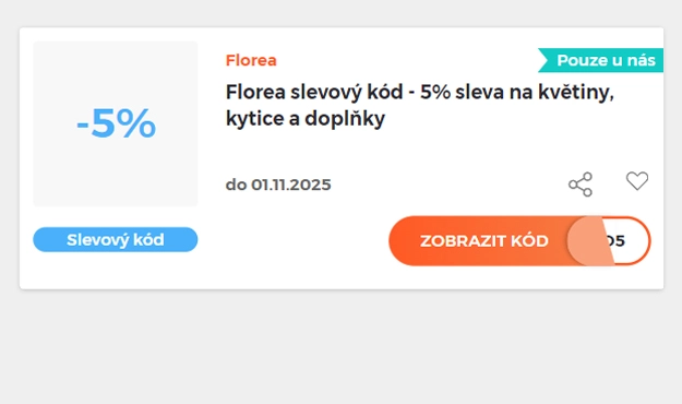 Sleva - 5% platí na nákup v e-shopu Florea.cz pokud zadáte slevový kód v nákupním košíku. Využijte slevové kupóny Florea a nakupujte kytice a květiny levněji