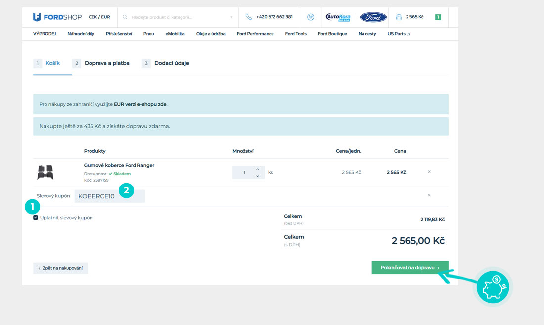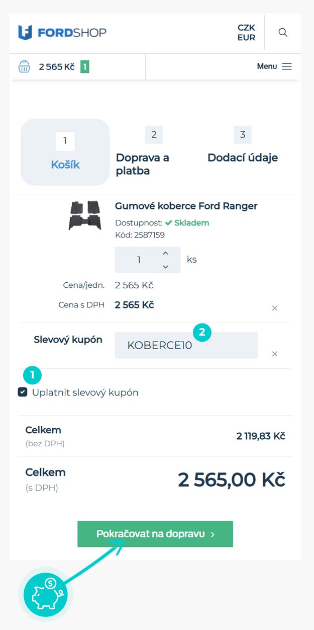 Vyberte si produkt v eshopu Fordshop.cz, o který máte zájem, stiskněte tlačítko "Vložit do košíku" a produkt se automaticky vloží do nákupního košíku. Přímo v nákupním košíku pod vybranými produkty klikněte na políčko "Slevový kupón". Zde vložte zkopírovaný slevový kód nebo jej ručně vepište a potvrďte tlačítkem "Uplatnit slevový kupón".