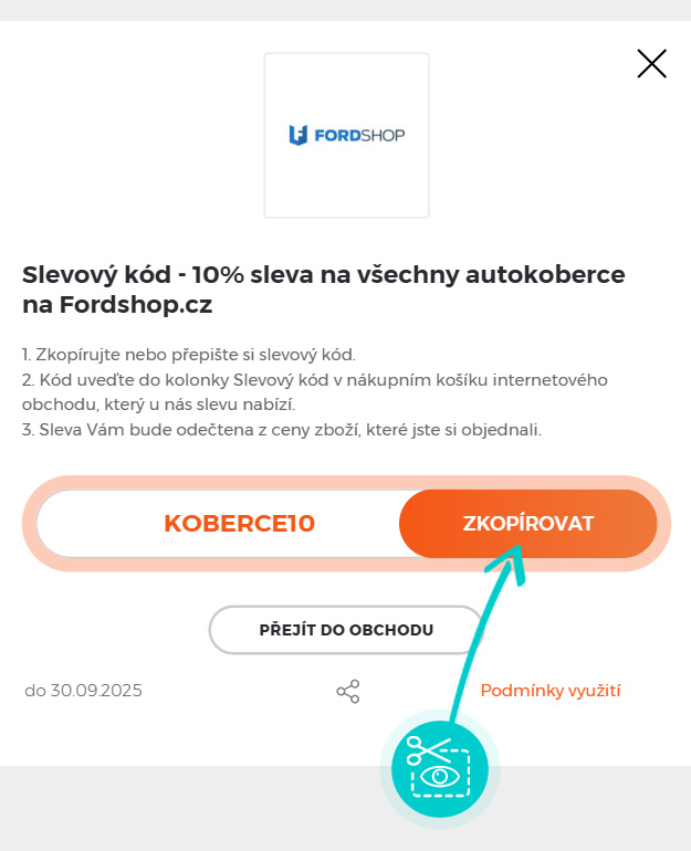 Zkopírujte nebo si opište slevový kód a klikněte na tlačítko "Přejít do obchodu". Následně budete přesměrováni přímo do eshopu Fordshop.cz.