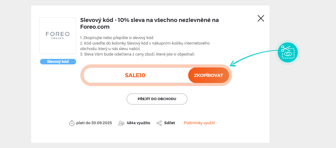 Zkopírujte nebo si opište slevový kód a klikněte na tlačítko "Přejít do obchodu". Následně budete přesměrováni přímo do eshopu Foreo.com.
