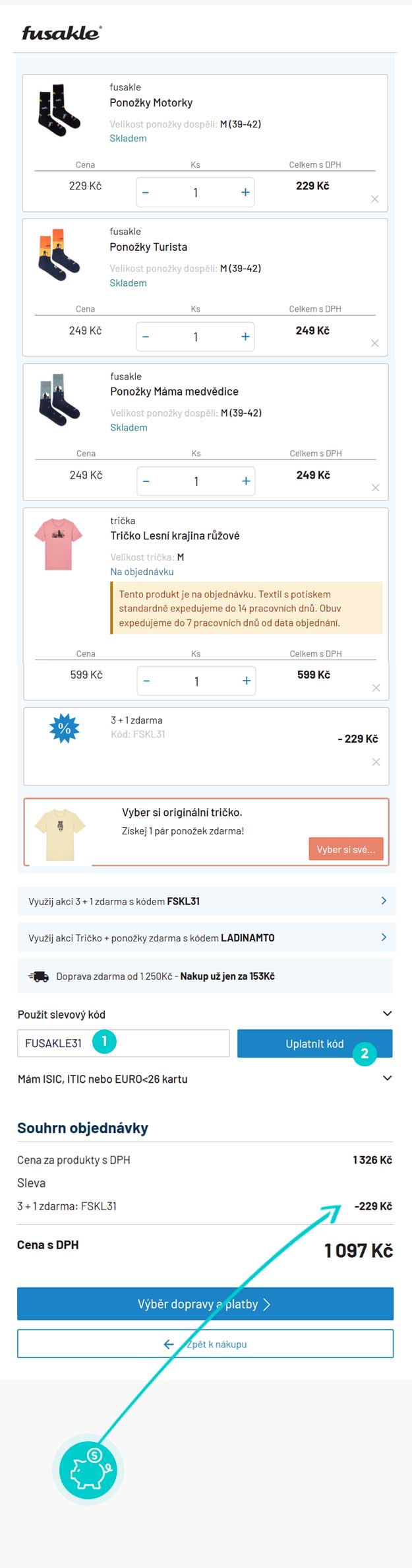 Jak uplatnit kód? Klikněte sem a zjistěte, jak na to.Ponožky zdarma do 229 Kč platí při nákupu triček, tričkošatů nebo mikin v eshopu fusakle.cz pokud zadáte slevový kód v nákupním košíku. Akci nelze kombinovat s jinými slevami a slevovými kupóny. Využijte slevový kupón fusakle a nakupujte ponožky levněji.