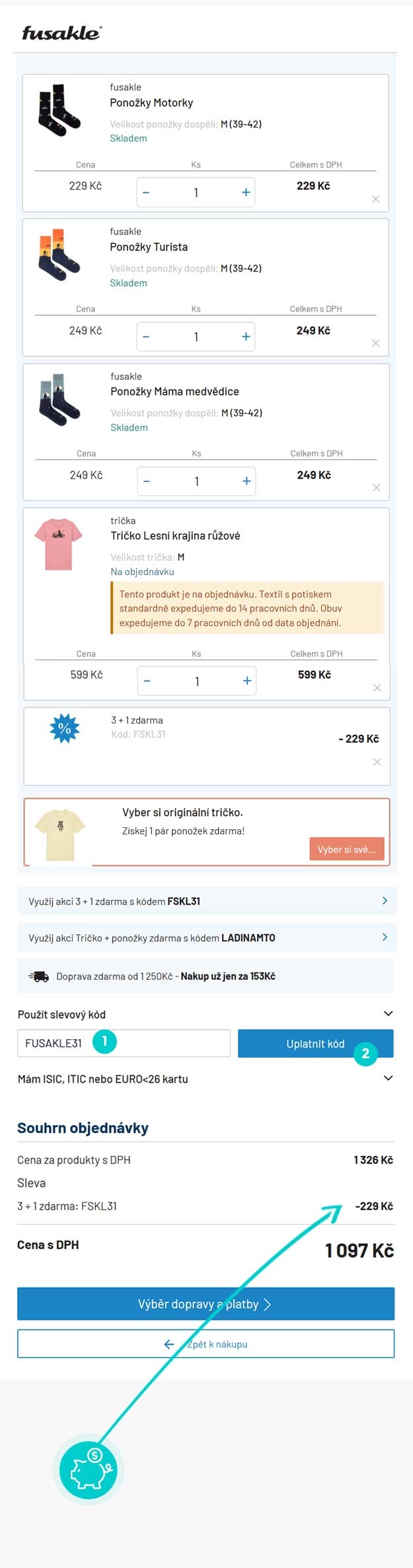 Jak uplatnit kód? Klikněte sem a zjistěte, jak na to.Sleva 3+1 platí na vybrané produkty v eshopu fusakle.cz pokud zadáte slevový kód v nákupním košíku. Při nákupu alespoň 4 produktů získáte čtvrtý zdarma. Neplatí na zlevněné produkty, sety, dárková balení a kolekci Pomáhám. Nelze kombinovat s jinými akcemi. Využijte slevový kupón fusakle a nakupujte ponožky levněji.