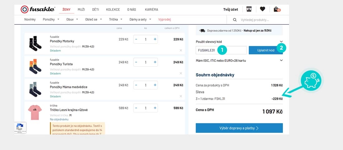 Vyberte si produkt v e-shopu Fusakle.cz, o který máte zájem, stiskněte tlačítko „Do košíku“ a produkt se automaticky vloží do nákupního košíku. Přímo v nákupním košíku naleznete vpravo v části „Shrnutí“ políčko „Použít slevový kód“. Zde vložte zkopírovaný slevový kód nebo jej ručně vepište a potvrďte tlačítkem „Uplatnit kód“.