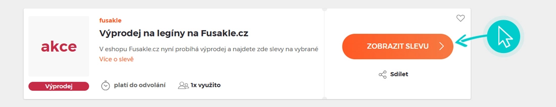 Vyberte si na naší stránce konkrétní Fusakle slevu a klikněte na tlačítko „Viz slevu“. Automaticky budete přesměrováni přímo na akční nabídku v internetovém obchodě Fusakle.cz, kde můžete produkt nakoupit se slevou.