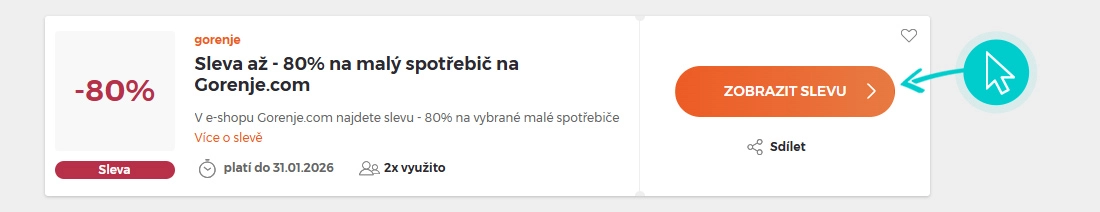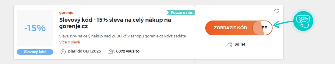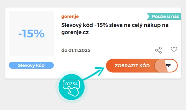 Vyberte si konkrétní slevový kód na naší stránce, který si chcete uplatnit v e-shopu Gorenje.com. Klikněte na oranžové tlačítko "Zobrazit kód".