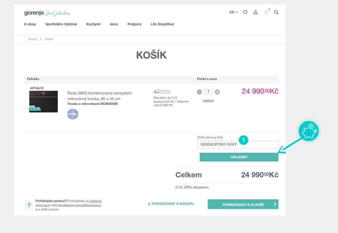 Vyberte si produkt v e-shopu Gorenje.com, o který máte zájem, stiskněte tlačítko "Vložit do košíku" a produkt se automaticky vloží do nákupního košíku. Přímo v nákupním košíku pod vybranými produkty v sekci Dokončit objednávku klikněte na políčko "Slevový kód". Zde vložte zkopírovaný slevový kód nebo jej ručně vepište a potvrďte tlačítkem "Uplatnit“.