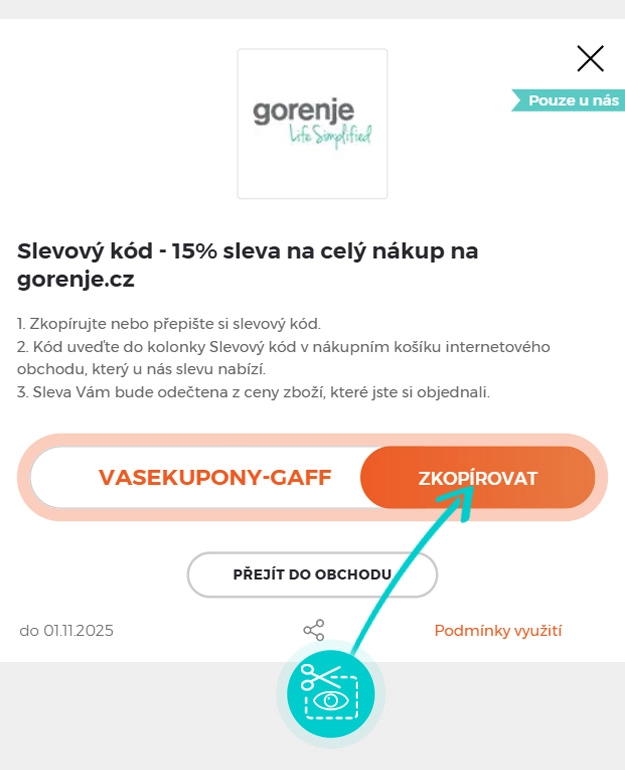 Zkopírujte nebo si opište slevový kód a klikněte na tlačítko "Přejít do obchodu". Následně budete přesměrováni přímo do e-shopu Gorenje.com.