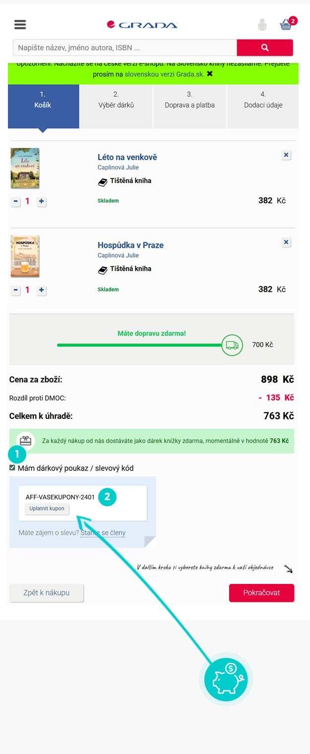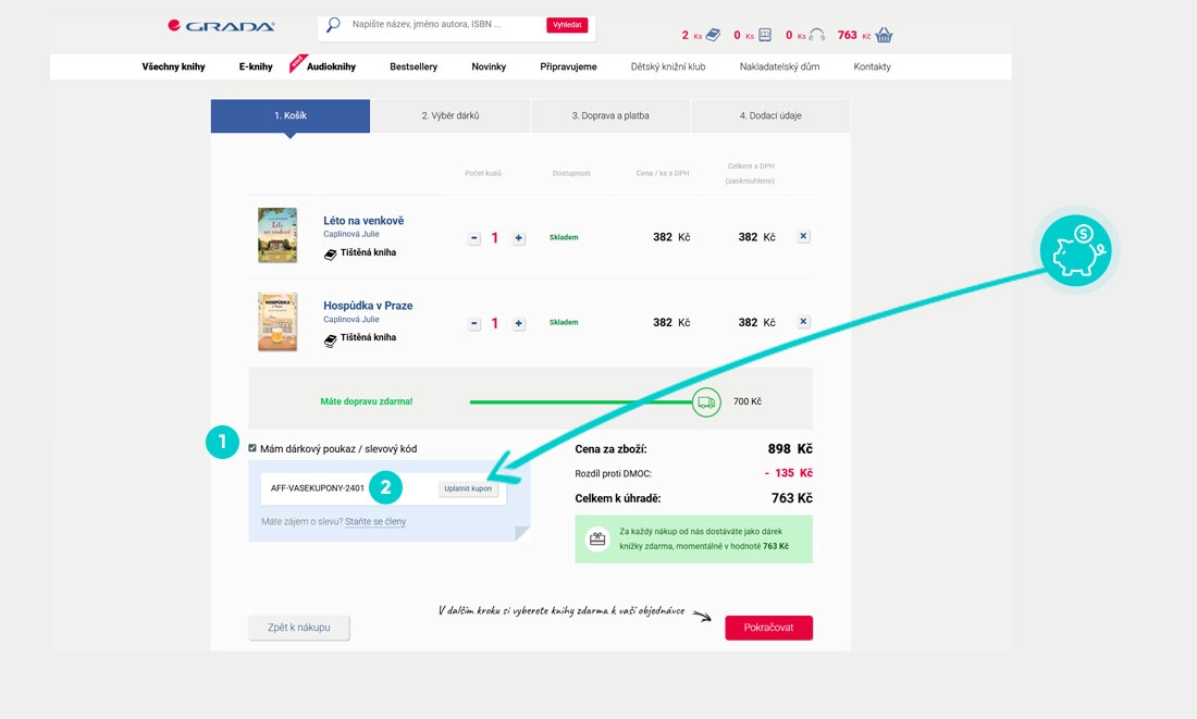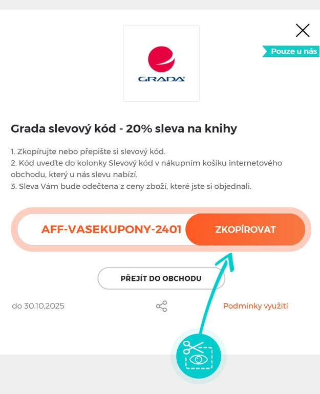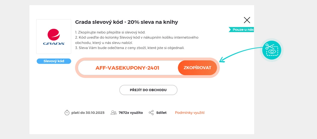 Zkopírujte nebo si opište slevový kód a klikněte na tlačítko "Přejít do obchodu". Následně budete přesměrováni přímo do eshopu Grada.cz.